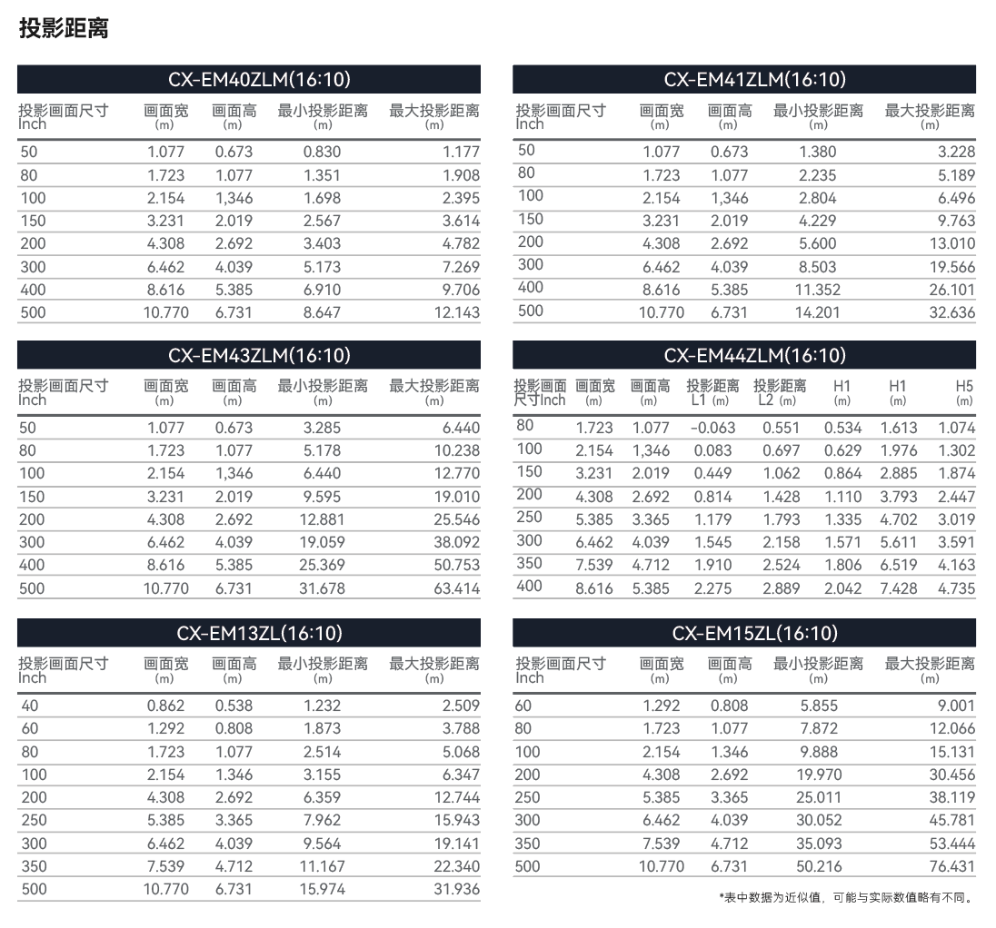 投影尺寸40~500寸